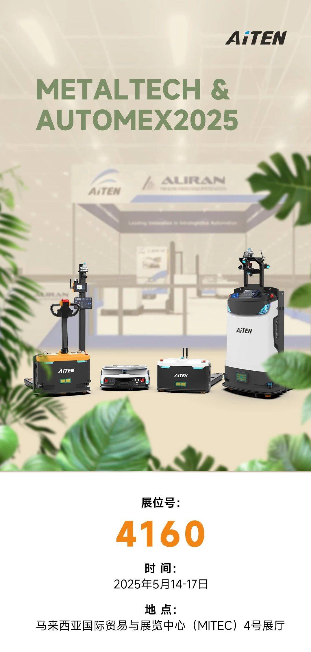 倒计时启动!诚邀您参与现场动态演示,milan米兰AiTEN将携搬运移动机器人AM15,MP10,APE15,TT15惊艳亮相(2025.5.14-17)。